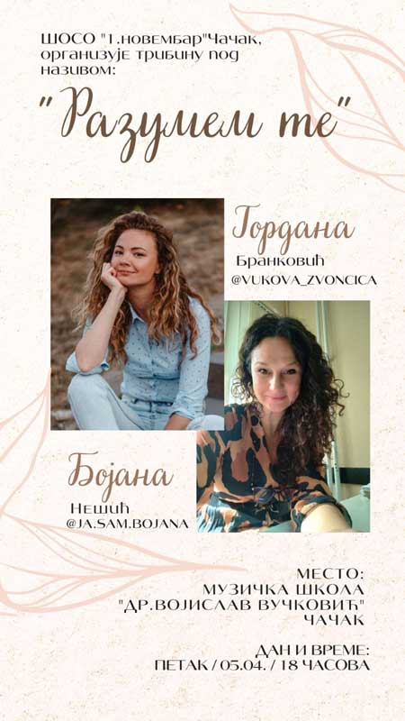 Драги родитељи, ДОБРОДОШЛИ на трибину „Разумем те“, на којој ће гостовати МАЈКЕ деце са развојним потешкоћама. Разменитe искуства и повежите се. Лакше је када делимо судбине.